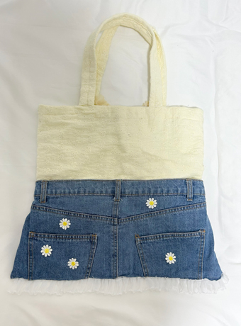トートバッグが洋服を着ているかのようなデザインにしました。デニムは自分の使わなくなった服をリメイクして使いました。