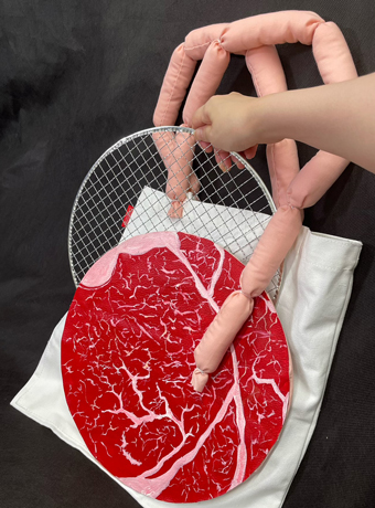 お肉の魅せ方をどうするかで悩みました。絵の具での色の出し方が難しく、焼き目は実際に網に絵の具を塗ってつけたり、納得がいくお肉が描けるまで色んなお肉を作りました。