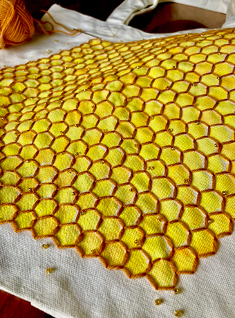 蜜感を表現するために、先にアクリルガッシュでひとセルずつグラデーション着色するのが大変でした。また、金色のビーズを散りばめて縫い付けることで、きらきら光沢感も追加しました。その後、全体を毛糸でふちを縫い取りました。