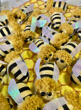 また、羽をどのように作るか悩みました。オーロラポリエステル生地に接着芯を貼り付け厚みをだし、一枚一枚切り抜きました。光沢のある生地を選んだことで、光によってキラキラ輝く様子は、ミツバチをよりリアルに表現できたのかなと思います。