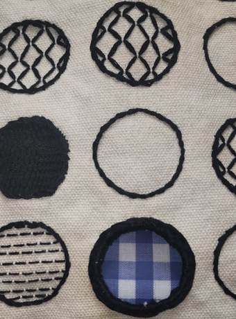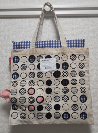 シンプルなバッグを作ろうと思い規則的に並んだ同じ大きさの円を黒い糸だけで刺繍しました。