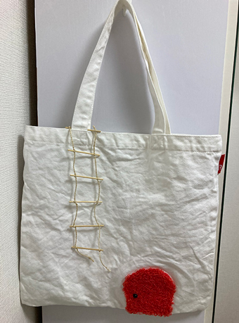 全体的に飛び出す絵本をイメージして制作しました。そのため、ポケットをチーズの柄にし、その中からねずみがのぞいている様子を表現するときに、ねずみは少しチーズよりも立体的にしました。横にあるりんごはねずみが一部食べたように見せるためになくなった部分をチェーンステッチで表現しました。そして、トートバック全体が家に見えるようにするために、反対の面はドアとはしごをつけました。