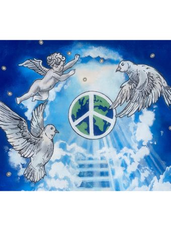 地球の周りのピースマークと天使、平和の象徴であるハトで平和を表しました。パールの部分はずっと大事にしていたネックレスが壊れてしまった物で天使が降らす幸せの雨として落とし込みました。ネックレスとしてではなく新たにバッグとして輝かせる事ができたと思います!