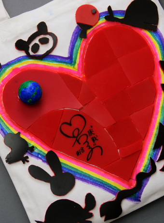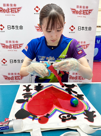その気持ちを込めて、普段使っている卓球のラバーを再利用して動物や虫、人を表現してトートバックに貼り付けて作成しました。
