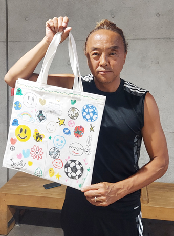 夏休み中の練習後に、サッカーボールやスマイルマークをひとつずつ描いていき、皆で楽しく完成させた作品です。